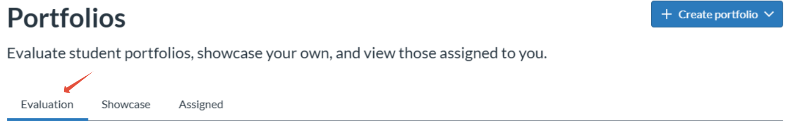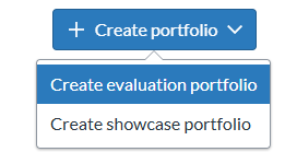 If you are an instructor, you will also see an Evaluation tab, which lists any Evaluation Portfolios you have created. Clicking the '+Create portfolio' will allow you to create either an evaluation or showcase portfolio.
